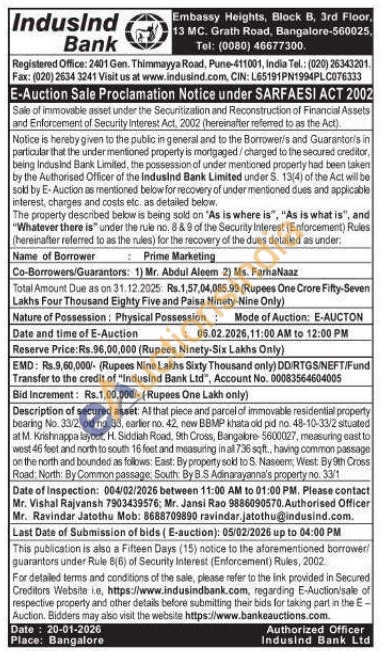 Description of secured asset: All that piece and parcel of immovable residential property bearing No. 33/2, old no. 33, earlier no. 42, new BBMP khata old pid no. 48-10-33/2 situated at M. Krishnappa layout, H. Siddiah Road, 9th Cross, Bangalore- 5600027, measuring east to west 46 feet and north to south 16 feet and measuring in all 736 sqft., having common passage on the north and bounded as follows: East: By property sold to S. Naseem, West By 9th Cross Road: North: By Common passage, South By BS Adinarayanna's property no. 33/1