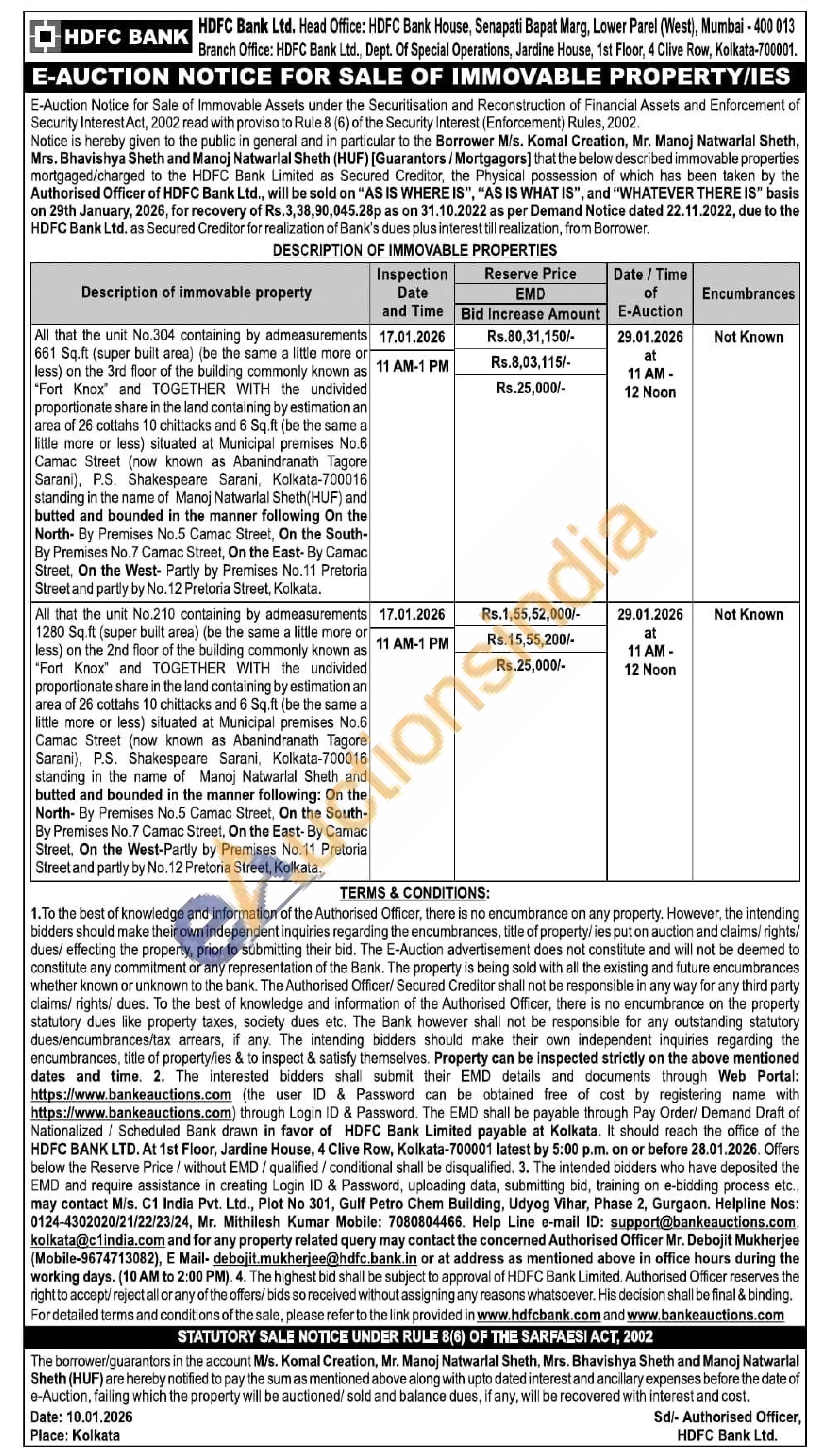 All that the unit No.210 containing by admeasurements 1280 Sq.ft (super built area) (be the same a little more or less) on the 2nd floor of the building commonly known as "Fort Knox and TOGETHER WITH the undivided proportionate share in the land containing by estimation ar area of 26 cottahs 10 chittacks and 6 Sq.ft (be the same a little more or less) situated at Municipal premises No.6 Camac Street (now known as Abanindranath Tagore Sarani), P.S. Shakespeare Sarani, Kolkata-700016 standing in the name of Manoj Natwarlal Sheth and butted and bounded in the manner following: On the North- By Premises No.5 Camac Street, On the South-By Premises No.7 Camac Street, On the East-By Camac Street, On the West-Partly by Premises No.11 Pretoria Street and partly by No. 12 Pretoria Street, Kolkata.
