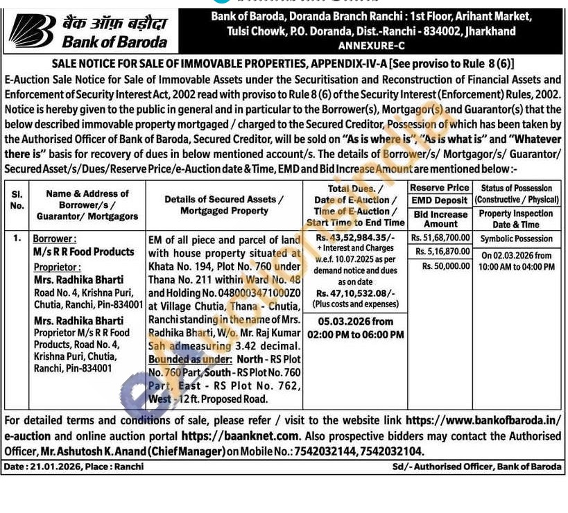 EM of all piece and parcel of land with house property situated at Khata No. 194, Plot No. 760 under Thana No. 211 within Ward No. 48 and Holding No. 048000347100020 at Village Chutia, Thana Chutia, Ranchi standing in the name of Mrs. Radhika Bharti, W/o. Mr. Raj Kumar Sah admeasuring 3.42 decimal. Bounded as under: North - RS Plot No. 760 Part, South-RS Plot No. 760 Part, East RS Plot No. 762, West-12 ft. Proposed Road.