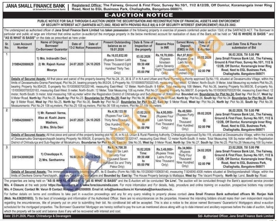 Details of Secured Assets: All that piece and parcel of the property-bearing Plot No.24. 25, 36 & 37 in N A and Urban and Rural Planning authority approved Sy.No.119, situated at Devasamudra Village, within the limits of Devasamudra Grama Panchayat, Plot No.24, bearing property No.953/24, E-Property No. 151000600700320145, measuring East-West: 12 Meter, North-South: 9 Meler, total Measuring sq.meters Plot No.25, bearing Property No.954/25, E-property No. 151000600700320146, measuring East-West: 12 Meter, North-South: 9 Meter, Total measuring 108 Meters, Plot No.36, bearing Property No.965/36, E-property No. 151000600700320163, measuring East-West: 9 meter, North-South: 12 Meter, Total Measuring 108 sq.meter, Plot No.37, bearing Property No. 966/37, E-property No. 151000600700320164, measuring East-West: 12 meter, North-South: 9 meter, total measuring 108 sq.meter within the Registration District of Chitradurga and Sub-Register of Molakalmur. Bounded on: Boundaries for Plot No.24: East by: Plot Bo.37, West by: Meter Road, North by: Plot No. 25, South by: Plot No. 23. Boundaries for Plot No.25; East by: Plot No. 36, West by: 9 Meter Road, North by: Plot No.26, South by: Plot No.24. Boundaries for Plot No.36; East by: 9 Meter Road, West by: Plot No.25. North by: Plot No.35, South by: Plot No 37. Boundaries for Plot No.37: East by: 9 Meter Road, West by: Plot No.24, North by: Plot No 36, South by: Plot No.38. Measurements: Plot No.24 108 sq.meters, Plot No.25 108 sq meters, Plot No 36 108 sq. meters, Plot No.37 108 so meters