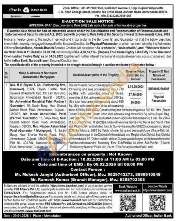 The immovable property bearing Sub-Plot No. 13 having land area admeasuring about 710 Sq.Mtrs with undivided share of Road, amenities & Ext, admeasuring about 240 Sq Mtrs total land area admeasuring about 950 Sq. Mirs with construction area admeasuring about 629 Sq. Mirs (RCC Construction) and admeasuring about 300 Sq. Mirs (Sheet Construction) total Construction area admeasuring about 929 Sq. Mtrs (As per Reg. Sale Deed No. 8747/2023) situated on Non-agricultural land bearing Final Plot 236/4 of T.P. Scheme No. 11 (allotted in lieu of Revenue Survey No. 167/A and 167/B Paki Sub Plot No. 04) and allotted the city Survey bearing No.008206 admeasuring about 2245 Sq. Mtrs ie. 2685 Sq Yards. situate, lying and being at Mouje Village-Rakhial Taluka Maninagar in the District of Ahmedabad and Registration District Sub-District of Ahmedabad-07 (Odhav) within state of Gujarat was belonged to Nitaben Ashwinbhai Patel bounded as under: Boundary: East: Sub Plot No. 14, West: Sub Plot No. 12, North This Survey Number Paiki Land, South: This Survey Number Paiki Land