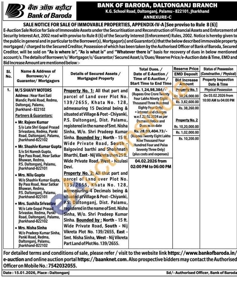Property No. 1: All that part and parcel of Land over Plot No. 139/2655, Khata No. 128, admeasuring 15 Decimal being & situated at Village & Post-Chiyanki, P.S. Daltonganj, Dist. Palamu, registered in the name of Smt. Nisha Sinha, W/o. Shri Pradeep Kumar Sinha. Bounded by: North - 15 ft. Wide Private Road, South -Balgovind barthi and Shobhnath Bharthi, East-Nij Vikreta then 25 ft. Wide Private Road, West - Naulasi Devi.