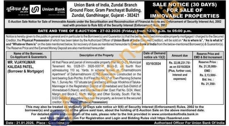 All that Piece and parcel of immovable property Flat No. D-23, Municipal Tenement No. 0328-07-3926-0001-F, Block-D, on fourth floor admeasuring 110 sq. Yards. In scheme known as "Dharmabhoomi Apartment of Daharmabhoomi (CTM) Association Constructed on the land bearing Sub-Plot No. 8 of Final Plot No. 37 of Town Planning Scheme No. 1, Survey No. 157 situate lying and being at Mouje: Khokhra of Taluka Maninagar in the Registration District of Ahmedabad and Sub-District of Ahmedabad-5 (Narol), and bounded as under. East: Flat No. D/24, West: Margin and Block-C, North: Margin and Other Society, South: Flat No. D/22 Details of encumbrances over the property, as known to the secured creditor, if any
