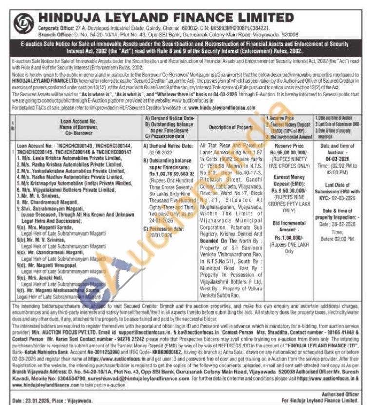 All That Piece And Parcel of Lands Admeasuring Acre 1.87 14 Cents (9062 Square Yards Or 7576.58 Meters) In N.T.S. No.512. Door No.40-17-3. Pitchaiah Street, Gandhi Colony, Labbipeta, Vijayawada, Revenue Ward No.17. Block No.21. Situated At Moghulrajpuram, Vijayawada, Within The Limits of Vijayawada Municipal Corporation, Patamata Sub Registry, Krishna District And Bounded On The North By: Property of Sri Samineni Venkata Vishnuvardhana Rao, In N.T.S.No.511, South By Municipal Road, East By Property In Possession of Vijayalakshmi Bottlers P Ltd. West By: Property of Valluru Venkata Subba Rao.