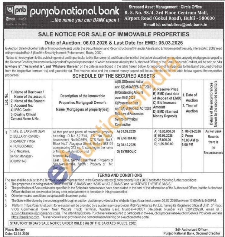 All that part and parcel of residential property bearing D.No.52/E/4, TS No.706/3, Assessment No.9402/E/4, CTS Ward No.6, Block No.7, Alagappa Street, Bellary-583101 admeasuring 312 sq. ft. standing in the name of Mrs. D. Lakshmi Devi and bounded by: East: Lane, North: Lane, West Property of Smt Narasamma, South Property of Mr. Durugappa