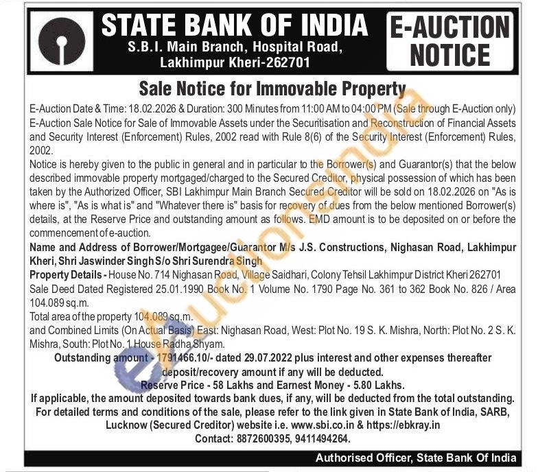 Property Details - House No. 714 Nighasan Road, Village Saidhari, Colony Tehsil Lakhimpur District Kheri 262701 Sale Deed Dated Registered 25.01.1990 Book No. 1 Volume No. 1790 Page No. 361 to 362 Book No. 826 / Area 104.089 sq.m. Total area of the property 104.089 sq.m. and Combined Limits (On Actual Basis) East: Nighasan Road, West: Plot No. 19 S. K. Mishra, North: Plot No. 2 S. K. Mishra, South: Plot No. 1 House Radha Shyam