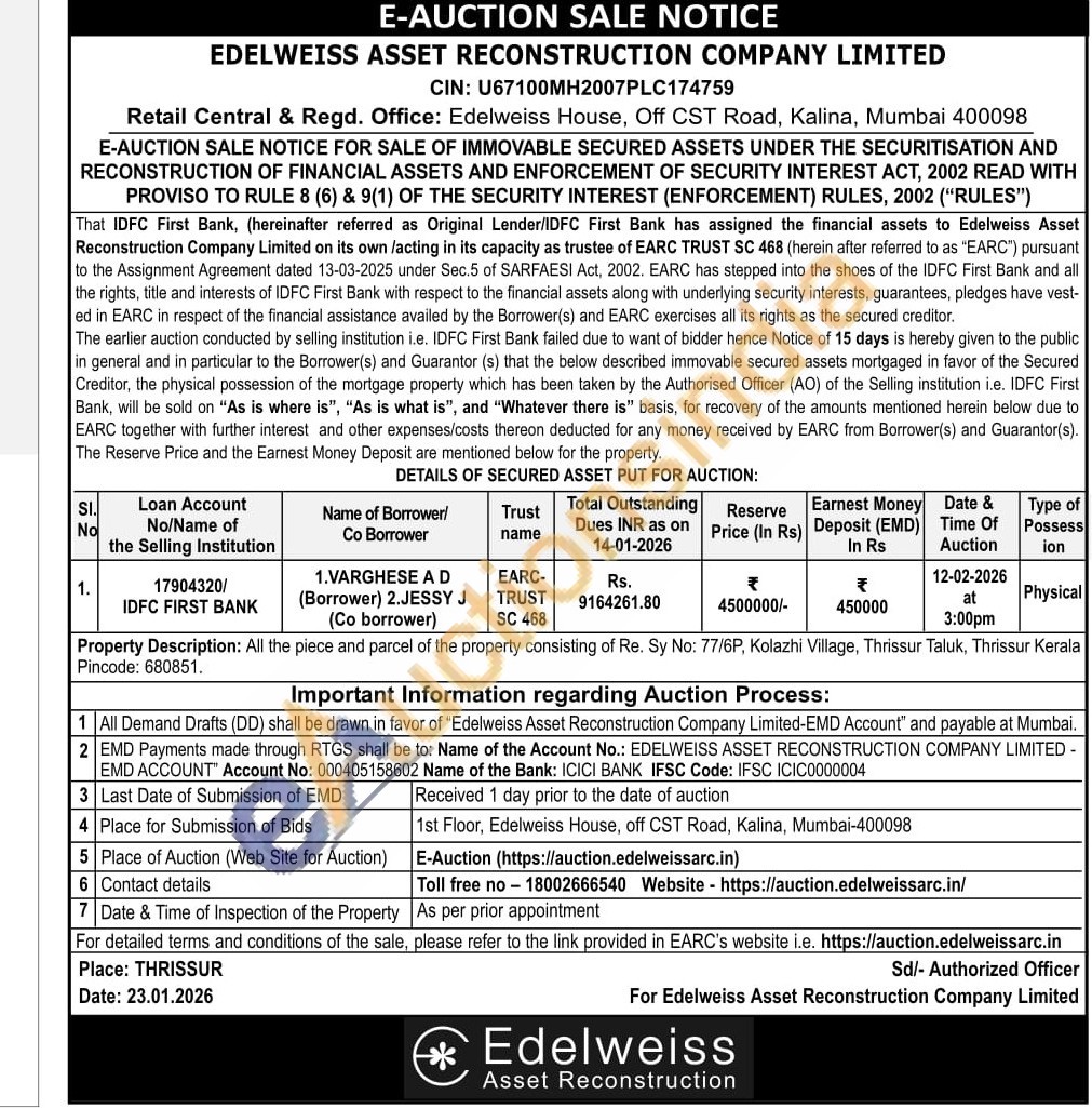 Property Description: All the piece and parcel of the property consisting of Re. Sy No: 77/6P, Kolazhi Village, Thrissur Taluk, Thrissur Kerala