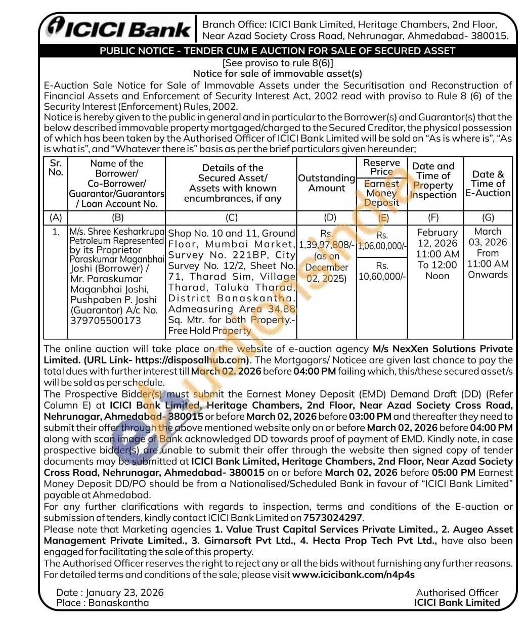 Shop No. 10 and 11, Ground Floor, Mumbai Market, Survey No. 221BP, City Survey No. 12/2, Sheet No. 71, Tharad Sim, Village Tharad, Taluka Tharad. District Banaskantha. Admeasuring Area 34.88 Sq. Mtr. for both Property.-Free Hold Property