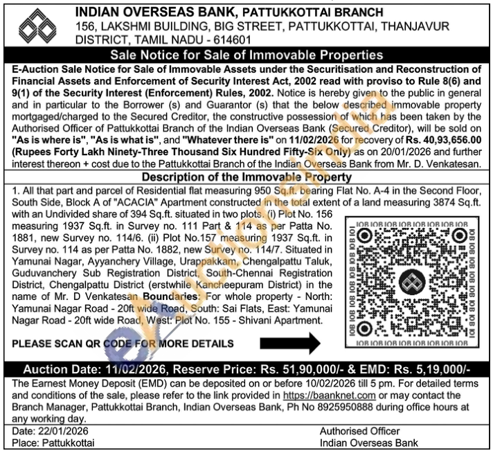 1. All that part and parcel of Residential flat measuring 950 Sq.ft. bearing Flat No. A-4 in the Second Floor, South Side, Block A of "ACACIA" Apartment constructed in the total extent of a land measuring 3874 Sq.ft. with an Undivided share of 394 Sq.ft. situated in two plots. (i) Plot No. 156 measuring 1937 Sq.ft. in Survey no. 111 Part & 114 as per Patta No. 1881, new Survey no. 114/6. (ii) Plot No.157 measuring 1937 Sq.ft. in Survey no. 114 as per Patta No. 1882, new Survey no. 114/7. Situated in Yamunai Nagar, Ayyanchery Village, Urappakkam, Chengalpattu Taluk, Guduvanchery Sub Registration District, South-Chennai Registration District, Chengalpattu District (erstwhile Kancheepuram District) in the name of Mr. D Venkatesan Boundaries: For whole property - North: Yamunai Nagar Road - 20ft wide Road, South: Sai Flats, East: Yamunai Nagar Road - 20ft wide Road, West: Plot No. 155 - Shivani Apartment.
