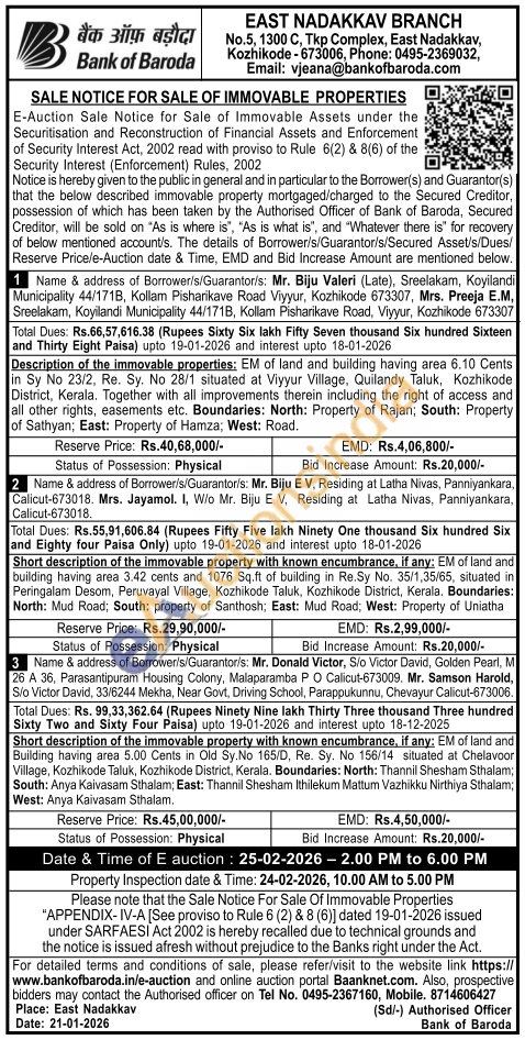 Short description of the immovable property with known encumbrance, if any: EM of land and building having area 3.42 cents and 1076 Sq.ft of building in Re.Sy No. 35/1,35/65, situated in Peringalam Desom, Peruvayal Village, Kozhikode Taluk, Kozhikode District, Kerala, Boundaries: North: Mud Road; South: property of Santhosh, East: Mud Road; West: Property of Uniatha