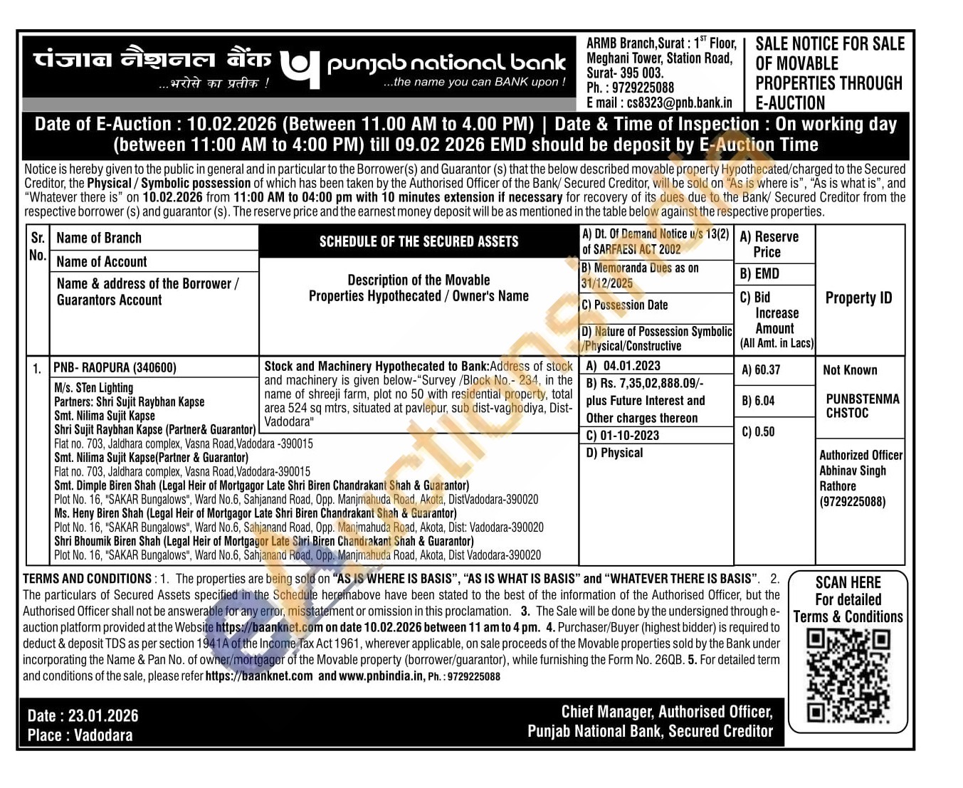 Stock and Machinery Hypothecated to Bank: Address of stock and machinery is given below-"Survey/Block No.- 234, in the name of shreeji farm, plot no 50 with residential property, total area 524 sq mtrs, situated at pavlepur, sub dist-vaghodiya, Dist-Vadodara"
