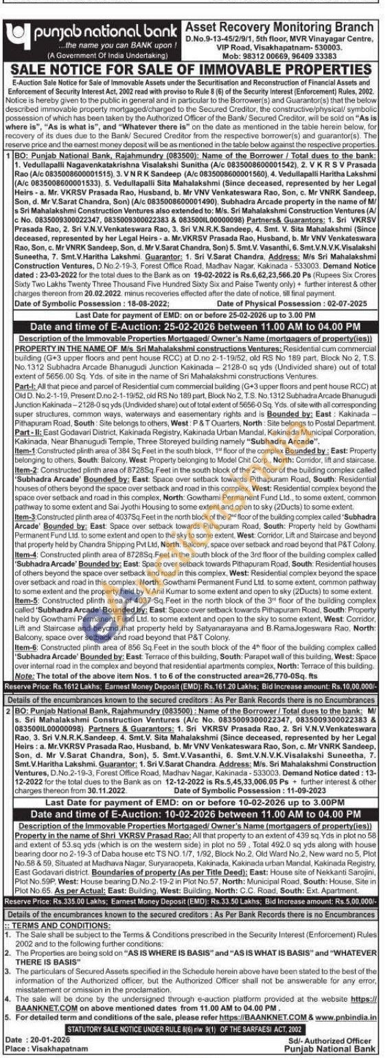 PROPERTY IN THE NAME OF M/s Sri Mahalakshmi constructions Ventures: Residential cum commercial building (G+3 upper floors and pent house RCC) at D.no 2-1-19/52, old RS No 189 part, Block No 2, T.S. No.1312 Subhadra Arcade Bhanugudi Junction Kakinada-2128-0 sq yds (Undivided share) out of total extent of 5656.00 Sq. Yds. of site in the name of Sri Mahalakshmi constructions Ventures. Part-l: All that piece and parcel of Residential cum commercial building (G+3 upper floors and pent house RCC) at Old D. No.2-1-19, Present D.no 2-1-19/52, old RS No 189 part, Block No 2, T.S. No. 1312 Subhadra Arcade Bhanugudi Junction Kakinada-2128-0 sq yds (Undivided share) out of total extent of 5656-0 Sq. Yds. of site with all corresponding super structures, common ways, waterways and easementary rights and is Bounded by: East: Kakinada-Pithapuram Road, South Site belongs to others, West: P&T Quarters, North: Site belongs to Postal Department. Part-II: East Godavari District, Kakinada Registry, Kakinada Urban Mandal, Kakinada Municipal Corporation, Kakinada, Near Bhanugudi Temple, Three Storeyed building namely "Subhadra Arcade". Item-1 Constructed plinth area of 384 Sq. Feet in the south block, 1 floor of the complex Bounded by: East: Property belonging to others, South Balcony, West: Property belonging to Model Chit Corp., North: Corridor, lift and staircase. Item-2: Constructed plinth area of 8728Sq. Feet in the south block of the 2 floor of the building complex called 'Subhadra Arcade' Bounded by: East: Space over setback towards Pithapuram Road, South: Residential houses of others beyond the space over setback and road in this complex, West: Residential complex beyond the space over setback and road in this complex, North: Gowthami Permanent Fund Ltd., to some extent, common pathway to some extent and Sai Jyothi Housing to some extent and open to sky (2Ducts) to some extent. Item-3:Constructed plinth area of 4037Sq. Feet in the north block of the 2nd floor of the building complex called 'Subhadra Arcade Bounded by: East Space over setback towards Pithapuram Road, South: Property held by Gowthami Permanent Fund Ltd. to some extent and open to the sky to some extent, West: Corridor, Lift and Staircase and beyond that property held by Chandra Shipping Pvt Ltd, North: Balcony, space over setback and road beyond that P&T Colony, Item-4: Constructed plinth area of 8728Sq. Feet in the south block of the 3rd floor of the building complex called 'Subhadra Arcade Bounded by: East: Space over setback towards Pithapuram Road, South: Residential houses of others beyond the space over setback and road in this complex, West: Residential complex beyond the space over setback and road in this complex, North: Gowthami Permanent Fund Ltd. to some extent, common pathway to some extent and the property held by V Anil Kumar to some extent and open to sky (2Ducts) to some extent. Item-5: Constructed plinth area of 4037 Sq Feet in the north block of the 3rd floor of the building complex called 'Subhadra Arcade' Bounded by: East: Space over selback towards Pithapuram Road, South: Property held by Gowthami Permanent Fund Ltd. to some extent and open to the sky to some extent, West: Corridor, Lift and Staircase and beyond that property held by Satyanarayana and B.Rama.Jogeswara Rao, North: Balcony, space over setback and road beyond that P&T Colony. Item-6: Constructed plinth area of 856 Sq. Feet in the south block of the 4th floor of the building complex called 'Subhadra Arcade' Bounded by: East: Terrace of this building, South: Parapet wall of this building, West: Space over internal road in the complex and beyond that residential apartments complex, North: Terrace of this building. Note: The total of the above item Nos. 1 to 6 of the constructed area=26,770-0Sq. fts