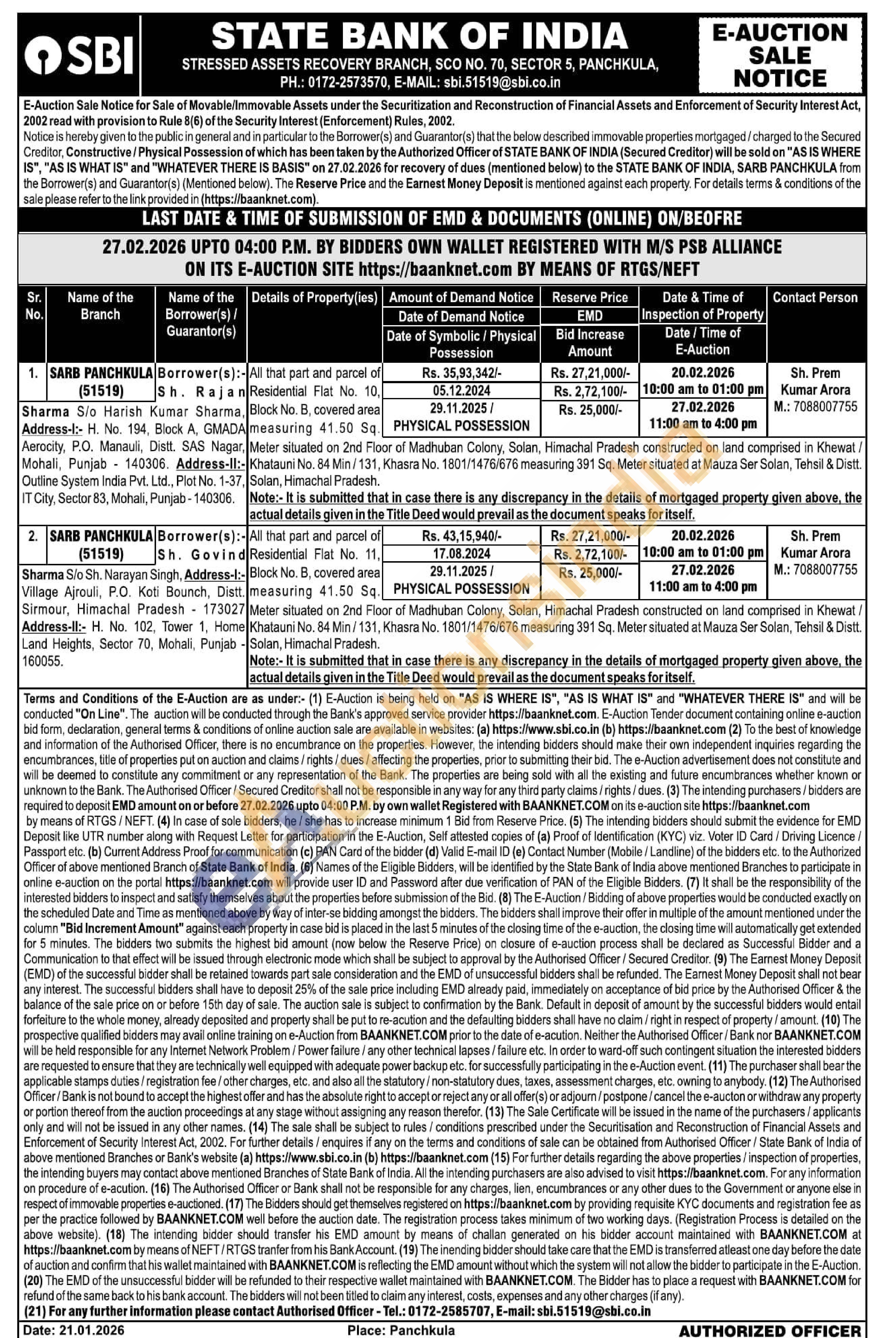 All that part and parcel of Residential Flat No. 10, Block No. B, covered area measuring 41.50 Sq.Meter situated on 2nd Floor of Madhuban Colony, Solan, Himachal Pradesh constructed on land comprised in Khewat /Khatauni No. 84 Min/131, Khasra No. 1801/1476/676 measuring 391 Sq. Meter situated at Mauza Ser Solan, Tehsil & Distt. Solan, Himachal Pradesh.