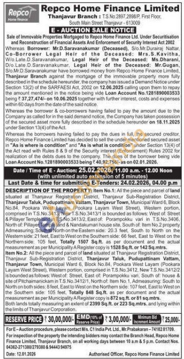 Item No.2: All the piece and parcel of land situated at Thanjavur Registration District, Thanjavur Sub-Registration District, Thanjavur Taluk, Pudupattinam Vattam, Thanjavur Town, Municipal Ward 6, Block No.84, Pookara West Layam (Pookara Layam West Street), Western portion, comprised in T.S.No.3412. New T.S.No. 3412/2 is bounded as follows: West of Street, East of Porampokku vani, South of: house & site of Pitchaimanickam in T.S.No.3412/1, North of Item No. 1. Admeasuring: South to North on both sides 8 feet, East to West on the Northern side: 107 feet, East to West on the Southern side: 105 feet. Totally 848 Sq.ft. as per document and the actual measurement as per Municipality A Register copy is 872 sq.ft. or 81 sq.mtrs. Both lands totally measuring an extent of 2399 Sq.ft. or 223 Sq.mtrs. and lying within the limits of Thanjavur Corporation