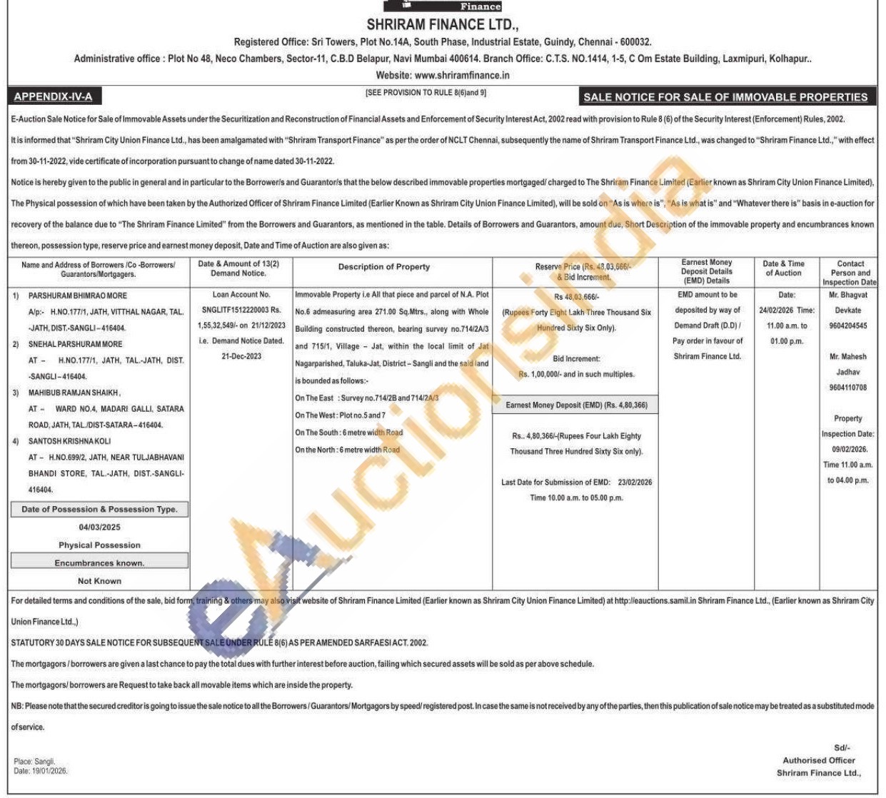 Immovable Property ie All that piece and parcel of N.A. Plot No.6 admeasuring area 271.00 Sq.Mtrs., along with Whole Building constructed thereon, bearing survey no.714/2A/3 and 71511, Village Jat, within the local limit of Jat Nagarparished, Taluka-Jat, District-Sangli and the said land is bounded as follows: On The East Survey no. 714/25 and 714/24/3