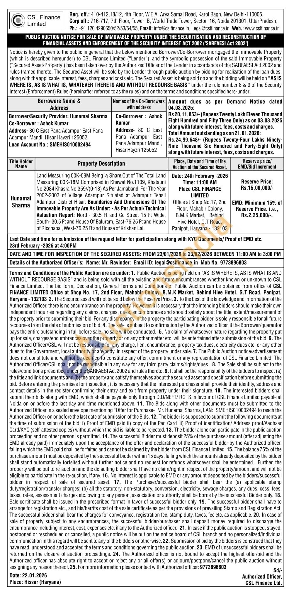 Land Measuring 00K-00M Being Share Out of The Total Land Measuring 00K-18M Comprised in Khewat No.1109, Khatauni No.2084 Khasra No.359//(0-18) As Per Jamabandi For The Year 2002-2003 of Village Adampur Situated at Adampur Tehsil Adampur District Hisar. Boundaries And Dimensions Of The Immovable Property Are As Under: - As Per Actual/Technical Valuation Report: North- 30.5 Ft and Cc Street 15 Pt Wide, South-30.5 Ft and House Of Baluram, East-76.25 Ft and House of Ricchapal, West-76.25 Ft and House of Krishan Lal.