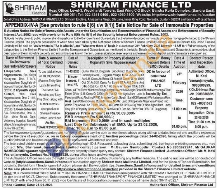 Authorized Officer M. Kasi Veeranjaneyulu Contact No : 9885888929 / K.Ch.Srinivasa Rao Contact No : +91 9989338862 / Customer care: 022-40081572