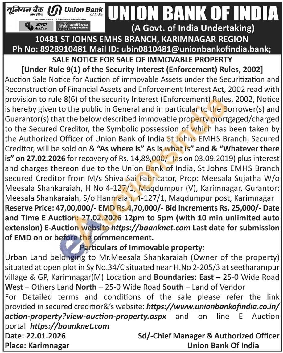 Particulars of Immovable property: Urban Land belonging to Mr.Meesala Shankaraiah (Owner of the property) situated at open plot in Sy No.34/C situated near H.No 2-205/3 at seetharampur village & GP, Karimnagar (M) Location and Boundaries: East - 25-0 Wide Road West-Others Land North - 25-0 Wide Road South - Land of Vendor