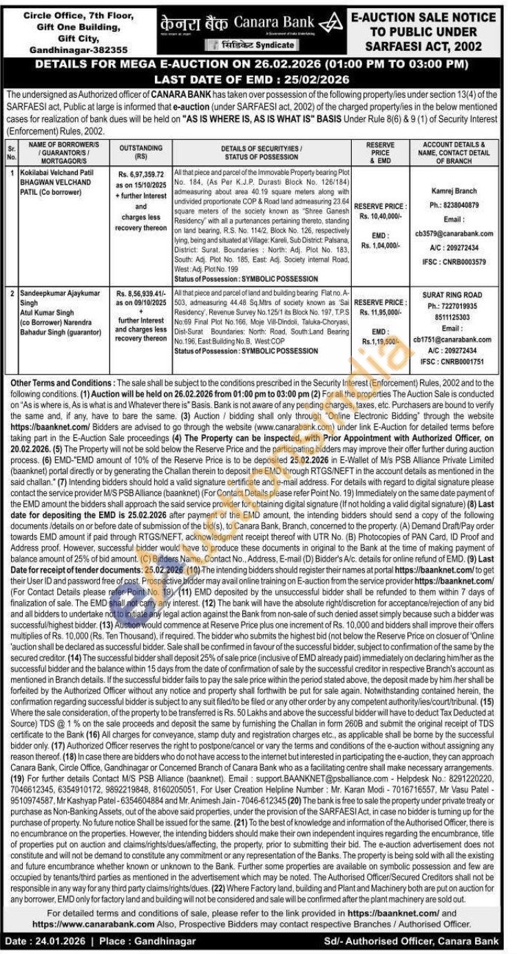 All that piece and parcel of the Immovable Property bearing Plot No. 184. (As Per K.J.P. Durasti Block No. 126/184) admeasuring about area 40.19 square meters along with undivided proportionate COP & Road land admeasuring 23.64 square meters of the society known as "Shree Ganesh Residency with all a purtenances pertaining thereto, standing on land bearing, R.S. No. 114/2, Block No. 126, respectively lying, being and situated at Village: Kareli, Sub District: Palsana, District: Surat. Boundaries: North: Adj. Plot No. 183, South: Adj. Plot No. 185, East: Adj. Society internal Road, West: Adj. Plot No. 199