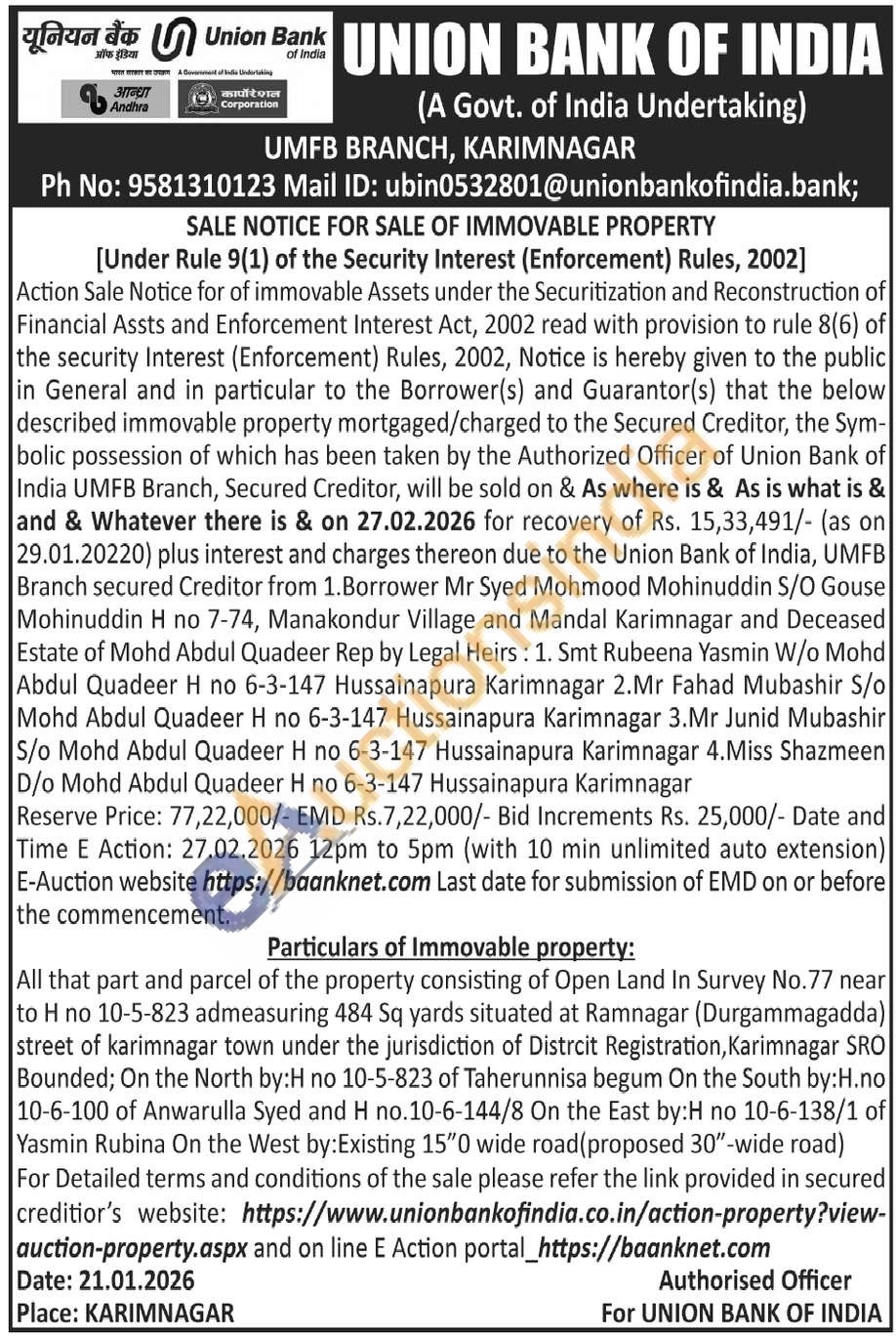 Particulars of Immovable property: All that part and parcel of the property consisting of Open Land In Survey No.77 near to H no 10-5-823 admeasuring 484 Sq yards situated at Ramnagar (Durgammagadda) street of karimnagar town under the jurisdiction of Distrcit Registration, Karimnagar SRO Bounded; On the North by:H no 10-5-823 of Taherunnisa begum On the South by:H.no 10-6-100 of Anwarulla Syed and H no.10-6-144/8 On the East by:H no 10-6-138/1 of Yasmin Rubina On the West by:Existing 15"0 wide road(proposed 30"-wide road)