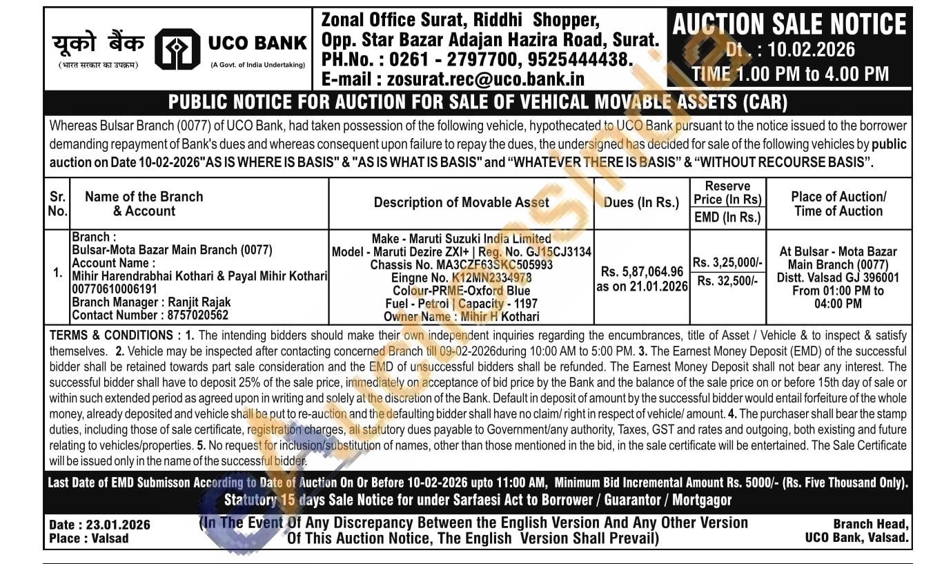 Make - Maruti Suzuki India Limited Model - Maruti Dezire ZXI+ | Reg. No. GJ15CJ3134 Chassis No. MA3CZF63SKC505993 Eingne No. K12MN2334978 Colour-PRME-Oxford Blue Fuel - Petrol | Capacity - 1197 Owner Name : Mihir H Kothar