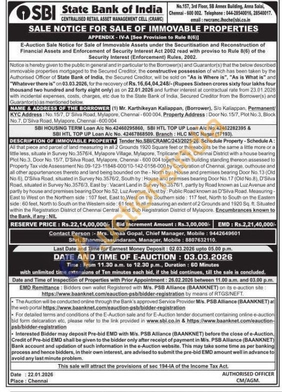 All that piece and parcel of land measuring in all 2 Grounds 1920 Square feet or thereabouts be the same a little more or a little less, situate in Survey No.3576/4, Mylapore Village, Mylapore, Triplicane Taluk, Chennai District with a house bearing Plot No.3. Door No. 15/7, D'Silva Road, Mylapore, Chennai-600 004 together with building standing thereon assessed to Property Tax vide Assessment No. 09-123-11848-000/10-142-0156-000 by Corporation of Chennai, garage, outhouse and all other appurtenances thereto and land being bounded on the-North by House and premises bearing Door No. 13 (Old No.6). D'Silva Road, situated in Survey No. 3576/2, South by: House and premises bearing Door No. 17 (Old No.8), D'Silva Road, situated in Survey No.3576/3, East by: Vacant Land in Survey No.3576/1, partly by Road known as Luz Avenue and partly by house and premises bearing Door No. 52, Luz Avenue, West by: Public Road known as D'Silva Road. Measuring-East to West on the Northem side: 107 feet, East to West on the Southern side: 117 feet, North to South on the Eastern side: 60 feet, North to South on the Western side: 61 feet. In all measuring an extent of 2 Grounds and 1920 Sq. ft. Situated within the Registration District of Chennai Central and Sub Registration District of Mylapore. Encumbrances known to the Bank, if any: NIL