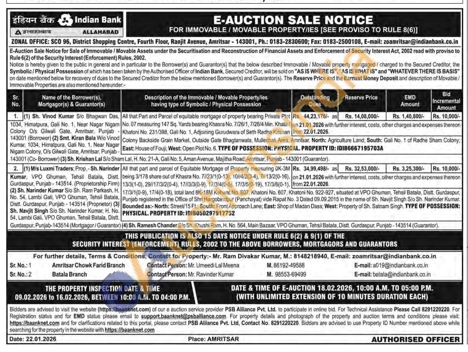Mr. Umeedi Lal Meena Μ. 86192-49588 E-mail: a019@indianbank.co.in & Mr. Ravinder Kumar Μ. 98553-69499 E-mail: batala@indianbank.co.in