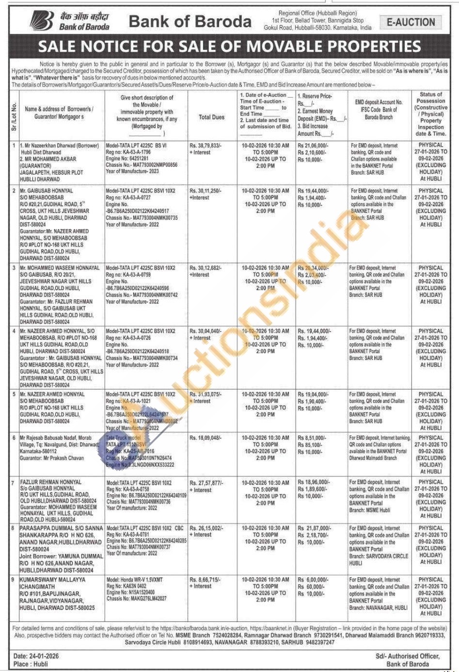 contact the Authorised officer on Tel No. MSME Branch 7524028284, Ramnagar Dharwad Branch 9730291541, Dharwad Malamaddi Branch 9620719333, Sarvodaya Circle Hubli 8108914693, NAVANAGAR 8788393210, SARHUB 9482397247