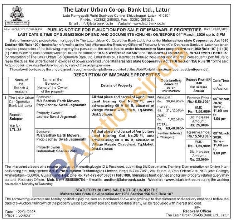 Contact no : 8888889764;-E-mail Id: auction@laturbank.co.in