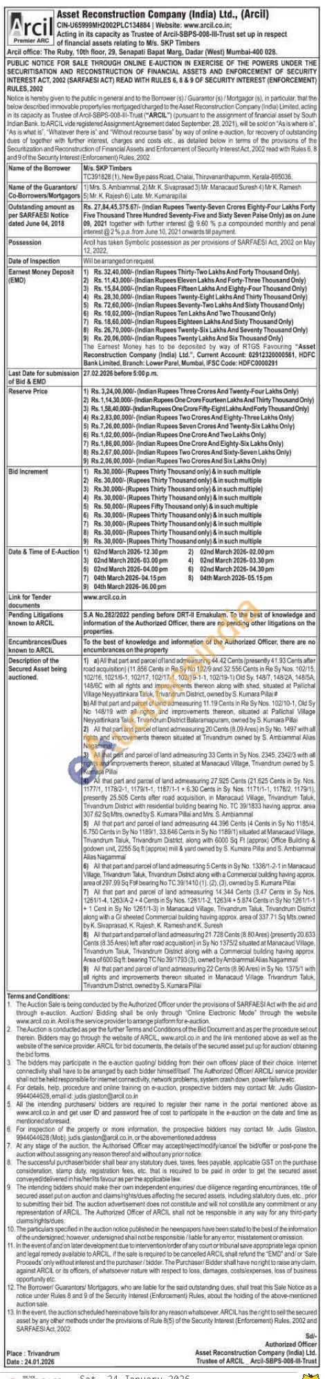 1) a) All that part and parcel of land admeasuring 44.42 Cents (presently 41.93 Cents after road acquisition) (11.856 Cents in Re Sy No 102/9 and 32.556 Cents in Re Sy Nos. 102/15, 102/16, 1021/6-1, 102/17, 102/17-1, 102/19-1-1, 102/19-1) Old Sy. 148/7, 148/2A, 148/5A, 148/6C with all rights and improvements thereon along with shed, situated at Pallichal Village Neyyattinkara Taluk, Trivandrum District, owned by S. Kumara Pilai# b) All that part and parcel of land admeasuring 11.19 Cents in Re Sy Nos. 102/10-1, Old Sy No 148/19 with all rights and improvements thereon, situated at Pallichal Village Neyyattinkara Taluk, Trivandrum District Balaramapuram, owned by S. Kumara Pillai