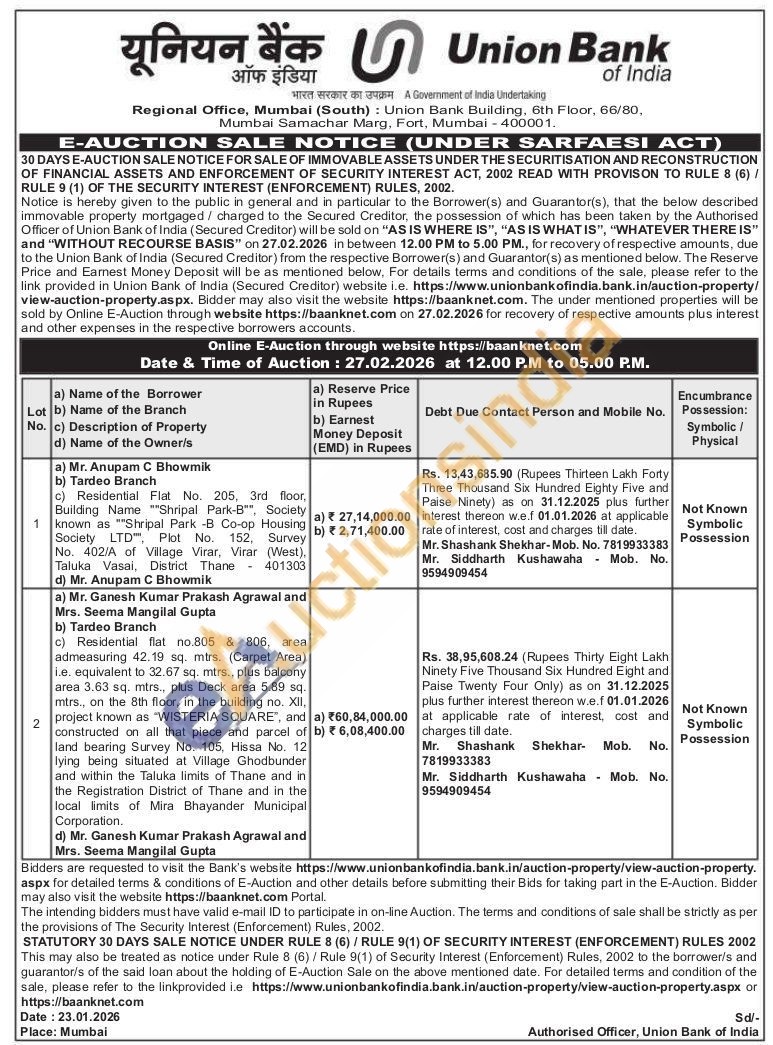 Residential flat no.805 & 806, areal admeasuring 42.19 sq. mtrs. (Carpet Area) i.e. equivalent to 32.67 sq. mtrs., plus balcony area 3.63 sq. mtrs., plus Deck area 5.89 sq. mtrs., on the 8th floor, in the building no. XII, project known as "WISTERIA SQUARE, and constructed on all that piece and parcel of land bearing Survey No. 105, Hissa No. 12 lying being situated at Village Ghodbunder and within the Taluka limits of Thane and in the Registration District of Thane and in the local limits of Mira Bhayander