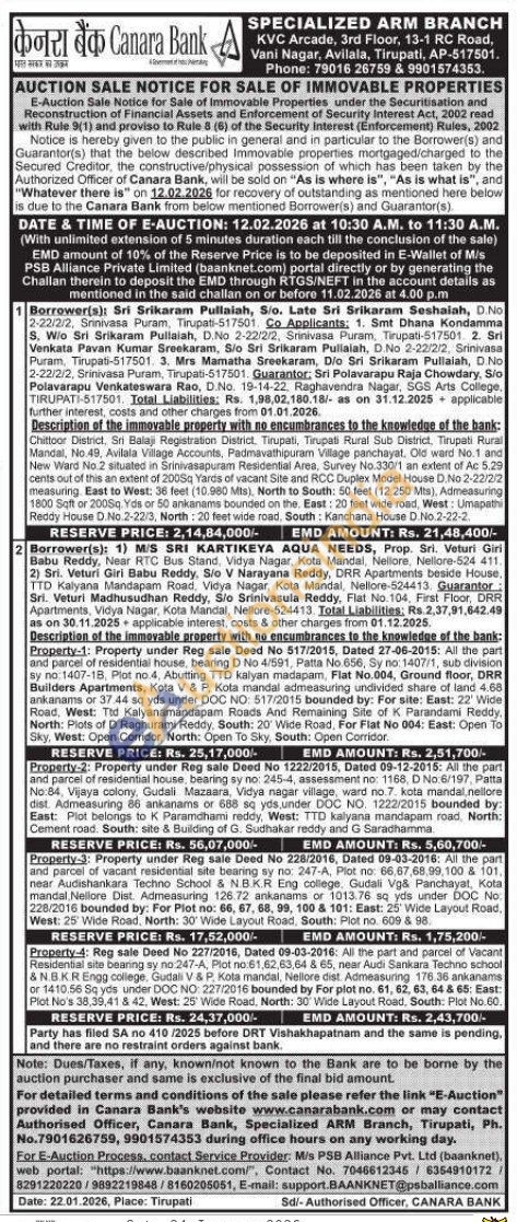 1) Chittoor District, Sri Balaji Registration District, Tirupati, Tirupati Rural Sub District, Tirupati Rural Mandal, No.49, Avilala Village Accounts, Padmavathipuram Village panchayat, Old ward No.1 and New Ward No.2 situated in Srinivasapuram Residential Area, Survey No.330/1 an extent of Ac 5.29 cents out of this an extent of 200Sq Yards of vacant Site and RCC Duplex Model House D.No 2-22/2/2 measuring. East to West: 36 feet (10,980 Mts), North to South: 50 feet (12.250 Mts), Admeasuring 1800 Sqft or 200Sq. Yds or 50 ankanams bounded on the. East: 20 feet wide road, West: Umapathi Reddy House D.No.2-22/3, North: 20 feet wide road, South: Kanchana House D.No.2-22-2