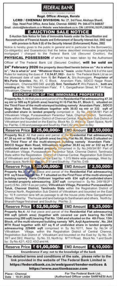 Property No.4: All that piece and parcel of the Residential Flat admeasuring 950 sqft (plinth area) (together with covered car park bearing No.1304 measuring 280 sqft) bearing Flat No. 1344 and situated on the 4th Floor, 13th Block, of the multi-storeyed building namely NPL Anjli Apartments, No. 264 MTH Road together with 427 sq ft of undivided share in landed property admeasuring 229400 sqft comprised in Sy No.167/1, New Sy No.34 of Villivakkam Village, within the Registration District of Central Chennai, Registration Sub District of Villivakkam and bounded on the East by: Sy No. 35, 39/1 and 39/2, West by: Sy No. 33, North by: MTH Road. Block No. 1 and South by: Sy No.42/1, 42/2, 43/2 and 44.