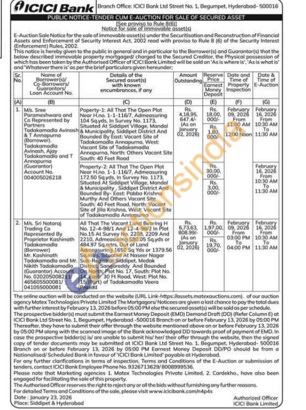 Poperty-1: All That The Open Plot Near H.no. 1-1-116/7, Admeasuring 104 Sq.yds, In Survey No. 1173, Situated At Siddipet Village, Mandal & Municipality, Siddipet District And Bounded By East: Vacant Site of Tadakamadia Annapurna, West: Vacant Site of Tadakamadla Annapurna, North: Others Vacant Site South: 40 Feet Road