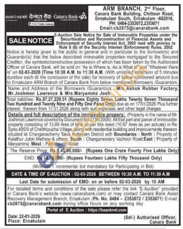 Details and full description of the immovable propery: (Property in the name of Mr Joshmon Lawrence covered by Document No.3196/2006): All that part and parcel of immovable property consisting of 13.89 Ares of land as per title deed (10.87 Ares as per actuals) in Re Syno 495/9 of Chetthipuzha Village, along with residential building and improvements therson situated at Changanacherry Taluk Kottayam District with Boundaries: North: Property of Kalathur Jobin Mathew & others: South Changanessery Vashoor Road East: Property of Maryamma, West: Panchayath Road