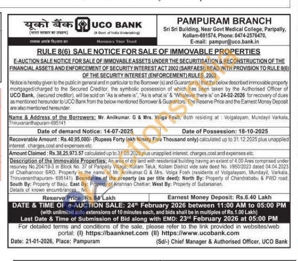 Description of the Immovable Properties: An area of dry land with residential building having an extent of 4.00 Ares comprised under resurvey No.204/19-3 in Block No. 37 of Panpaily Village, Kollam Taluk, Kollam District vide sale deed No. 1/950/2023 dated 04.04.2023 of Chathannoor SRO. Property in the name of Mr. Aniikumar G & Mrs. Volga Fosh (residents of Volgalayam, Mundayıl, Varkala, Thiruvananthapuram- 695141). Boundaries of the property (as per title deed): North By: Property of Chandrababu & PWD road South By: Property of Baju. East By: Property of Krishnan Chettiar, West By: Property of Sudarsanan. Details of known encumbrances Nil