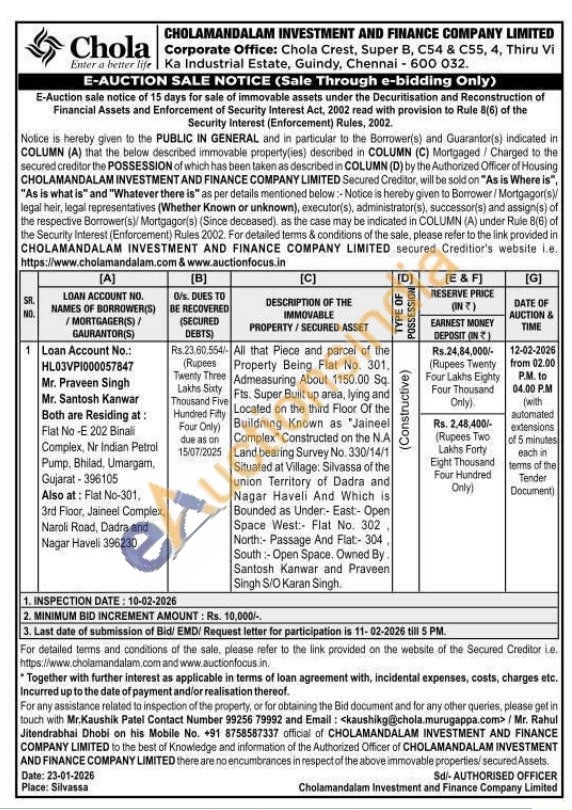 All that Piece and parcel of the Property Being Flat No. 301, Admeasuring About 1150.00 Sq. Fts. Super Built up area, lying and Located on the third Floor Of the Buildning Known as "Jaineel Complex Constructed on the N.A Land bearing Survey No. 330/14/1 Situated at Village: Silvassa of the union Territory of Dadra and Nagar Haveli And Which is Bounded as Under- East:- Open Space West: Flat No. 302 North:- Passage And Flat-304 South: Open Space. Owned By Santosh Kanwar and Praveen Singh S/O Karan Singh.