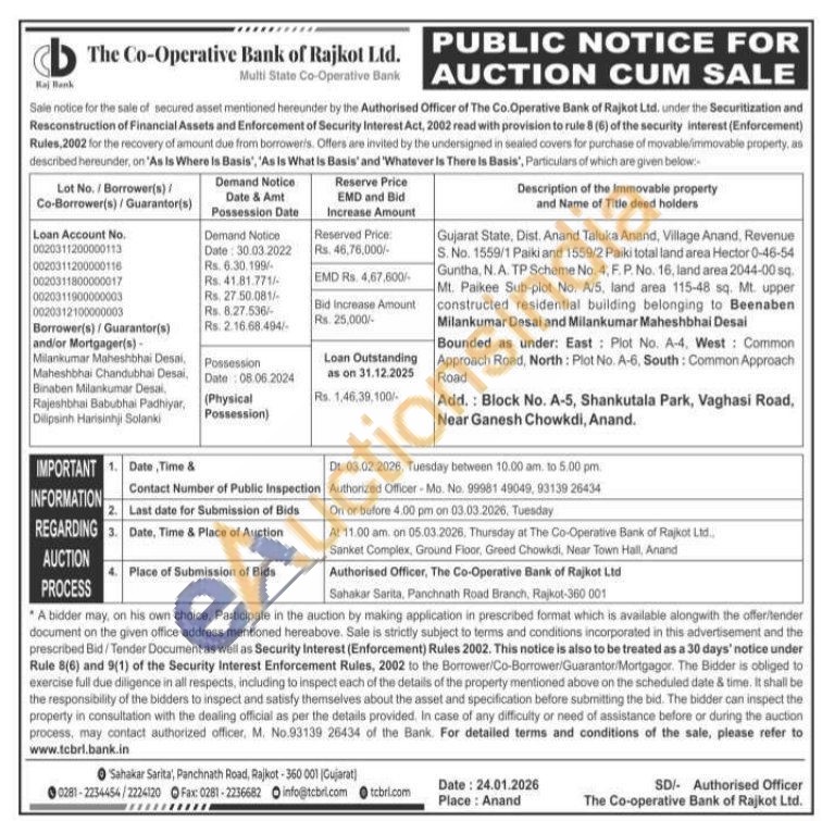 Gujarat State, Dist. Anand Taluka Anand, Village Anand, Revenue S. No. 1559/1 Paiki and 1559/2 Paiki total land area Hector 0-46-54 Guntha, N.A. TP Scheme No. 4, F. P. No. 16, land area 2044-00 sq. Mt. Paikee Sub-plot No. A/5, land area 115-48 sq. Mt. upper constructed residential building belonging to Beenaben Milankumar Desai and Milankumar Maheshbhai Desai Bounded as under: East: Plot No. A-4, West: Common Approach Road, North: Plot No. A-6, South: Common Approach Road