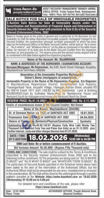 Immovable Property in the Name of Mr.Rajamohan Ragavan, S/o Ragavan: In Mayiladuthuras Registration District, Sembanarkoil Sub Registry. Tharangambadi Taluk, Arupathi Village, Vilanagar, Kothan Street, situated RS No. 190/1A Extent 1817 SqFt (168.80 Sq.Mtr) Residential Land & Building BOUNDARIES: East by Sudhakar Manai, West By Nandakumar House and Backyard, South by Kaliyaperumal House and Backyard, North by Street.