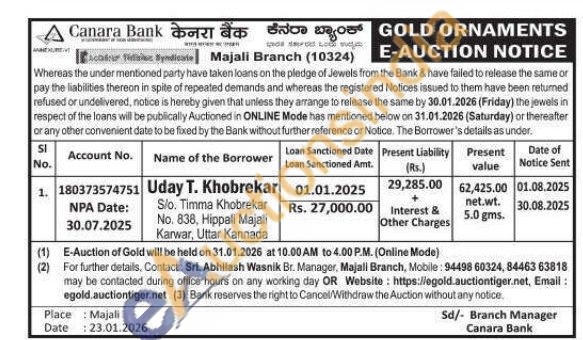 Canara Bank Gold Auctions Auction in Uttara Kannada
