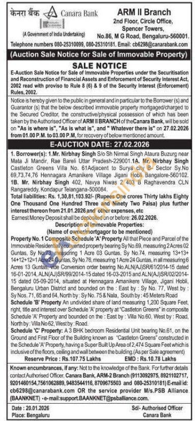 Property No. 1 Composite Schedule 'A' Property All that Piece and Parcel of the Immovable Residentially converted property bearing Sy No.69, measuring 2 Acres 02 Guntas, Sy No.73, measuring 1 Acre 03 Guntas. Sy No.74, measuring 13+13+ 14+12+12=1 Acre 24 Guntas, Sy No. 76, measuring 1 Acre 24 Guntas, in all measuring 6 Acres 13 Guntas, vide Conversion order bearing No.ALN(AJ)SR/61/2014-15 dated 16-01-2014, ALN(AJ)SR/99/2014-15 dated 16-03-2015 and ALN(AJ)SR/02/2014-15 dated 05-09-2014, situated at Hennagara Amanikere Village, Jigani Hobil, Bengaluru Urban District and bounded on the East by: Sy No. 77, West by: Sy Nos. 71, 65 and 64, North by: Sy No. 75 & Nala, South by: 45 Meters Road Schedule 'B' Property An undivided share of land measuring 1,200 Square Feet, right, title and interest over Schedule 'A' property at "Castleton Greens" in composite Schedule 'A' Property and bounded on the East by: Villa No.60, West by: Road, North by: Villa No 62, Westby: Road Schedule 'C' Property: A 3 BHK bedroom Residential Unit bearing No.61, on the Ground and First Floor of the Building known as "Castleton Greens" constructed in the Schedule 'A' Property, having a Super Built Up Area of 2,474 Square Feet which is inclusive of the floors, ceiling and wall between the building. (As per Sale agreement