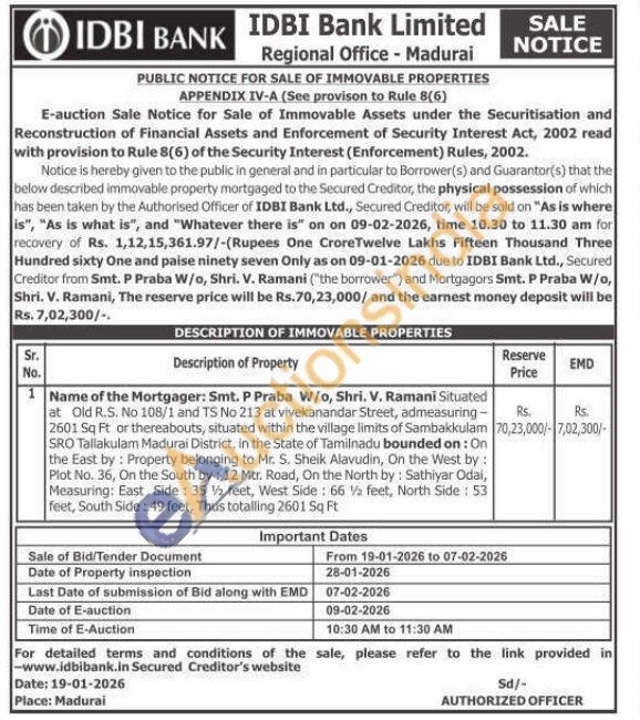 Name of the Mortgager: Smt. P Praba W/o, Shri. V. Ramani Situated at Old R.S. No 108/1 and TS No 213 at vivekanandar Street, admeasuring 2601 Sq Ft or thereabouts, situated within the village limits of Sambakkulam SRO Tallakulam Madurai District, in the State of Tamilnadu bounded on: On the East by: Property belonging to Mr. S. Sheik Alavudin, On the West by: Plot No. 36, On the South by: 12 Mtr. Road, On the North by: Sathiyar Odai, Measuring: East Side: 35 V½ feet, West Side: 66 ½ feet, North Side: 53 feet, South Side: 49 feet, Thus totalling 2601 Sq Ft