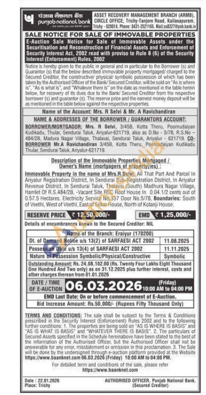 Immovable Property in the name of Mrs.R.Selvi: All That Part And Parcel In Ariyalur Registration District, In Sendurai Sub-Registration District, In Ariyalur Revenue District, In Sendurai Taluk, Thalavai (South) Madhura Nagar Village, Hamlet Of R.S.484/28, Vacant Site RCC Roof House in 0.04 1/2 cents out of 0.57.5 Hectares. Electricity Service No.337 Door No.5/78, Boundaries: South of Veethi, West of Veethi, East of Sekar House, North of Kolanji House