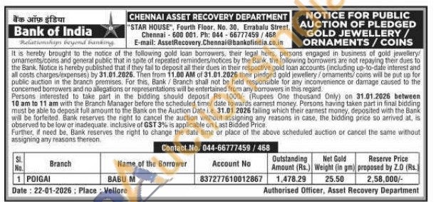 Bank of India Gold Auctions Auction in Vellore