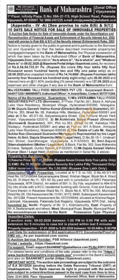 Description of the Properties: Located at NTS no.100, D.No.40-3/1-54 Asst No. 1073109544 Satyanarayana Street, Krishan Nagar, Block No. 4, Ward No. 29, R.Ward No. 11, 591.50 Sq yard with in jurisdiction of SRO Patamata Vijayawada, NTR District. An extent of 591 % Sq. Yds. equivalent to 494-674 So mts of site with a RCC residential building with Ground, First and Second Floors therein in Revenew Ward No. 11, Block No.4, NTS No. 100, Municipal Ward No.29, Old Assessment No. 13191, 9172, 6840, Subsequent Assessment No. 26122M, Present Assessment No. 1073109544, situated at Krishna Nagar, Labbipet, Vijayawada, Patamata Sub Registry, Vijayawada, NTR Dist, being bounded by: North: Property of Mr. DL Krishnamurthy, East: Property of Mr. A. Seetaramaiah and others, West: Municipal Road, South: Municipal Road.