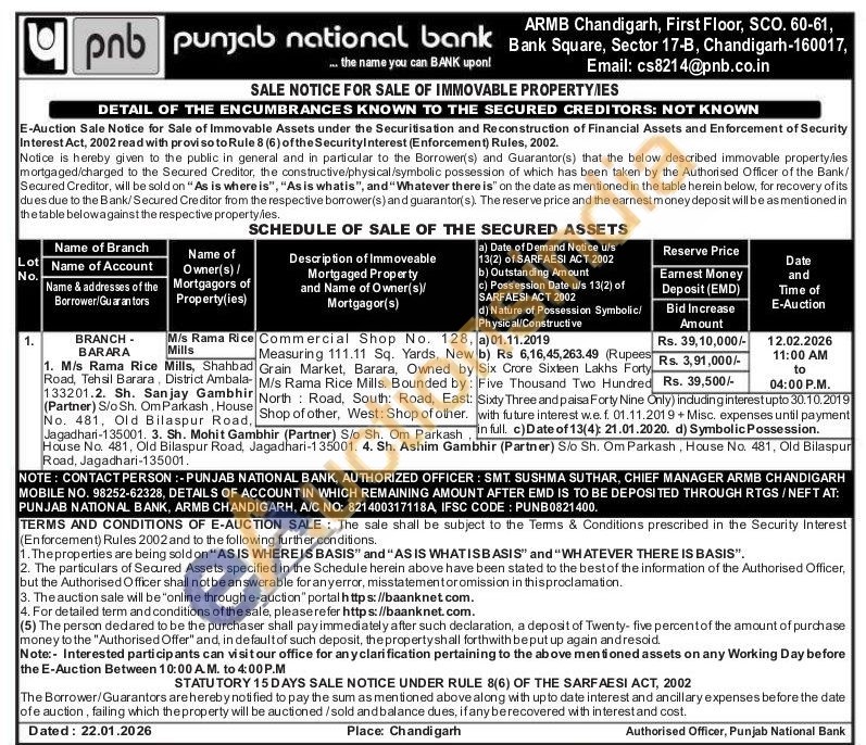 Commercial Shop No. 128, Measuring 111.11 Sq. Yards, New Grain Market, Barara, Owned by M/s Rama Rice Mills. Bounded by: North Road, South: Road, East: , Shop of other, West: Shop of other