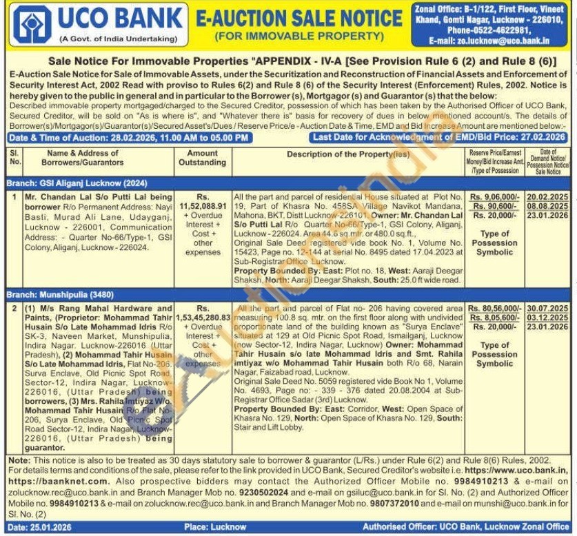 All the part and parcel of Flat no- 206 having covered area measuring 100.8 sq. mtr, on the first floor along with undivided proportionate land of the building known as "Surya Enclave" situated at 129 at Old Picnic Spot Road, Ismailganj, Lucknow (now Sector-12, Indira Nagar, Lucknow) Owner: Mohammad Tahir Husain s/o late Mohammad Idris and Smt. Rahila Imtiyaz w/o Mohammad Tahir Husain both Rio 68, Narain Nagar, Faizabad road, Lucknow.