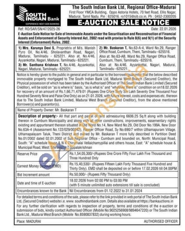Description of property: All that part and parcel of land admeasuring 6606.25 Sq.ft along with building thereon in Cumbum Municipality and along with all other constructions, improvements, easementary rights existing and appurtenant thereon situated in Old Ward No.14, New Ward No.29, Old Door No.199A, New Door No.63A-4 (Assessment No. 122/029/00342), Ranger Officer Road, Sy No.690/7 within Uthamapuram Village. Uthamapalayam Taluk, Theni District and owned by Mr. Baskaran T more fully described in Partition Deed No.01/2002 dated 02.01.2002 of Sub Registrar Office Cumbum and bounded on, North: Municipal Road, South: "A" schedule house & NK Thirumalai Vellaichamypillai and others house, East: "A" schedule house & Municipal Road, West: Site sold by T Gopalakrishnan
