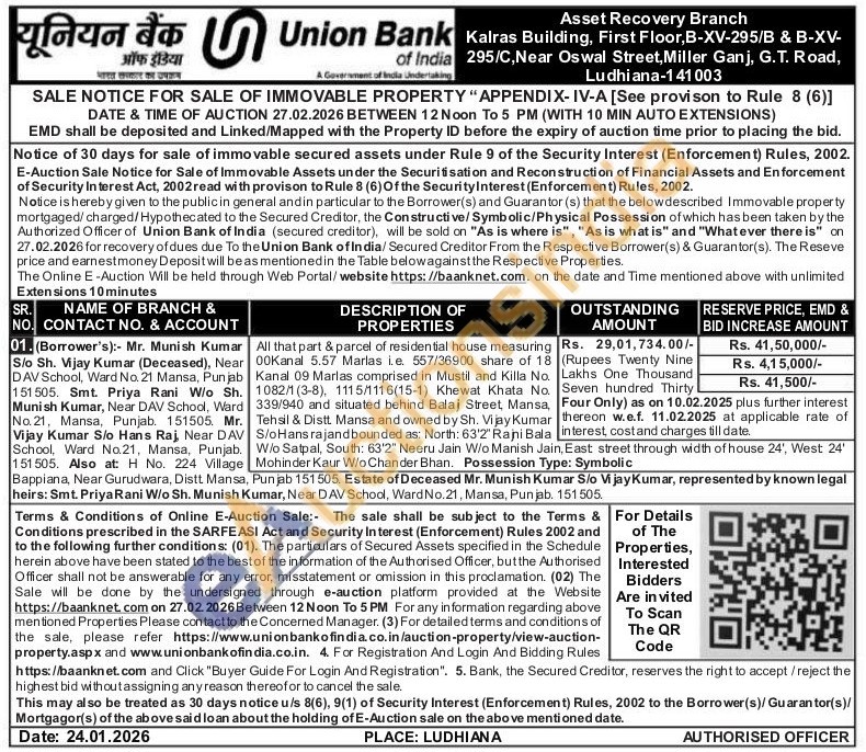 All that part & parcel of residential house measuring 00Kanal 5.57 Marlas i.e. 557/36900 share of 18 Kanal 09 Marlas comprised in Mustil and Killa No. 1082/1 (3-8), 1115/1116(15-1) Khewat Khata No. 339/940 and situated behind Balaj Street, Mansa,Tehsil & Distt Mansa and owned by Sh. Vijay KumarS/oHansrajandbounded as: North: 63'2" Rajni Bala W/o Satpal, South: 63'2" Neeru Jain W/o Manish Jain, East street through width of house 24', West 24' Mohinder Kaur W/o Chander Bhan