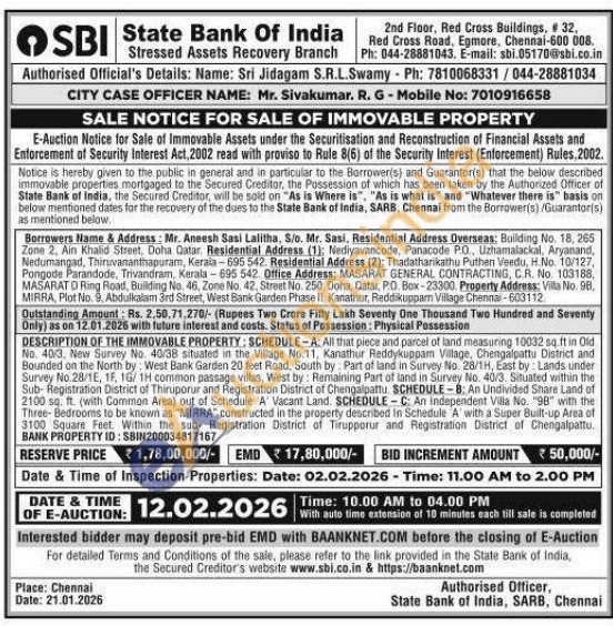 DESCRIPTION OF THE IMMOVABLE PROPERTY: SCHEDULE-A: All that piece and parcel of land measuring 10032 sq.ft in Old No. 40/3, New Survey No. 40/38 situated in the Village No.11, Kanathur Reddykuppam Village, Chengalpattu District and Bounded on the North by: West Bank Garden 20 feet Road, South by: Part of land in Survey No. 28/1H, East by: Lands under Survey No.28/1E, 1F, 16/1H common passage villas, West by: Remaining Part of land in Survey No. 40/3. Situated within the Sub-Registration District of Thiruporur and Registration District of Chengalpattu. SCHEDULE-B: An Undivided Share Land of 2100 sq. ft. (with Common Area) out of Schedule 'A' Vacant Land. SCHEDULE-C: An Independent Villa. No. "98" with the Three-Bedrooms to be known as "MIRRA" constructed in the property described in Schedule A with a Super Built-up Area of 3100 Square Feet Within the sub- Registration District of Tirupporur and Registration District of Chengalpattu. BANK PROPERTY ID: SBIN200034817167